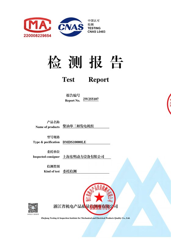 作为专业级发电设备,DMDS10000LE具备完整的检测报告,通过国家相关标准认证,核心保障维度如下: