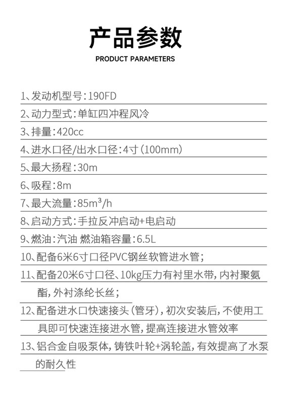 2.动力充足,运行稳定:搭载 190FD 型号发动机,配合 3600r/min 的额定转速,为水泵提供持续稳定动力,保障高流量排水持续作业。