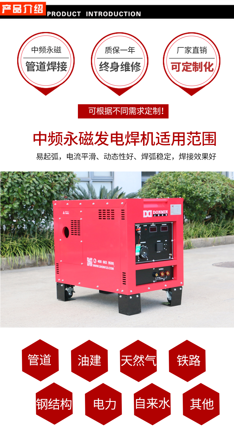 东明中频柴油发电电焊两用机 1、永磁中频电机,同轴一体结构 2、可直接电弧焊、氩弧焊 3、可输出交流电,方便施工现场电动工具的使用